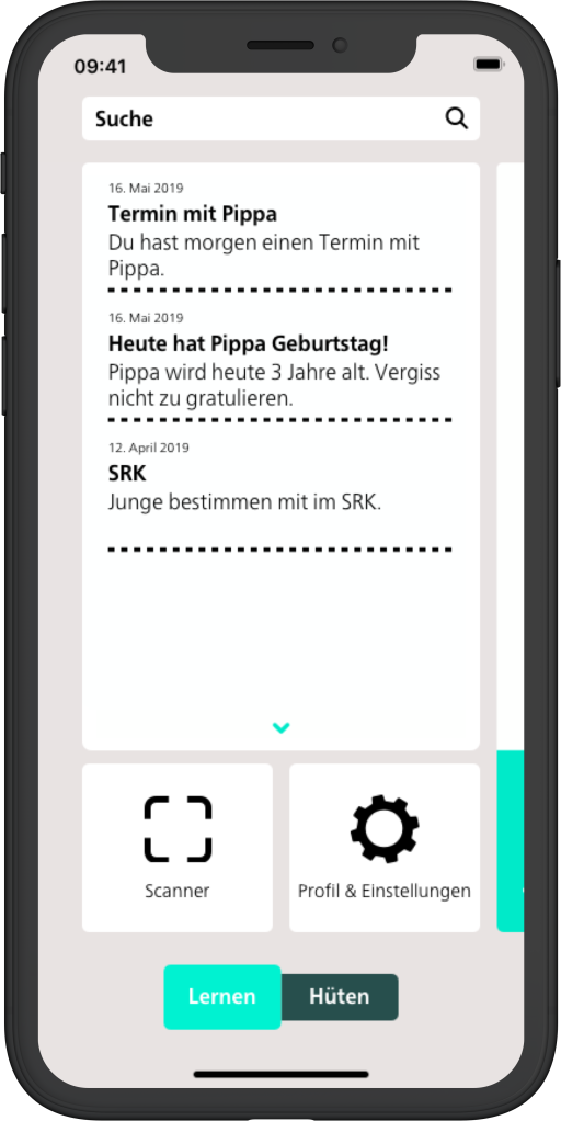 Im Bereich Hüten können Hütekinder und deren Gewohnheiten erfasst und Termine geplant werden. Dies hilft, den Überblick über die Hüteaufgaben nie zu verlieren. Ausserdem können Notizen gemacht und ein Tagebuch geführt werden.